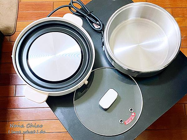 這台享食電熱鍋採分離式設計,全部分開為環式高效發熱盤的主機/上蓋/SUS304不鏽鋼內鍋