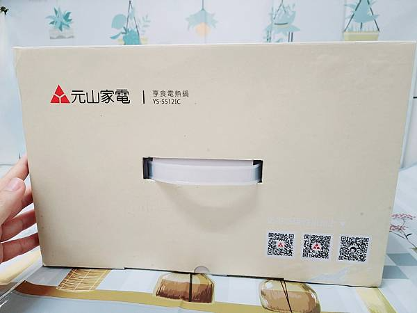 【元山家電_享食電熱鍋】外盒以純淨的米白色為底色,最上頭設計有手提把,無論是年終尾牙抽獎或是廚房家電選購,都非常方便一提就帶回家。