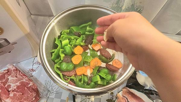 青椒2顆(切塊)、隔夜香腸適量(切片)、紅蘿蔔片適量(切片)、蒜頭3瓣(切片)、米酒1湯匙、鹽巴1匙、糖1小匙