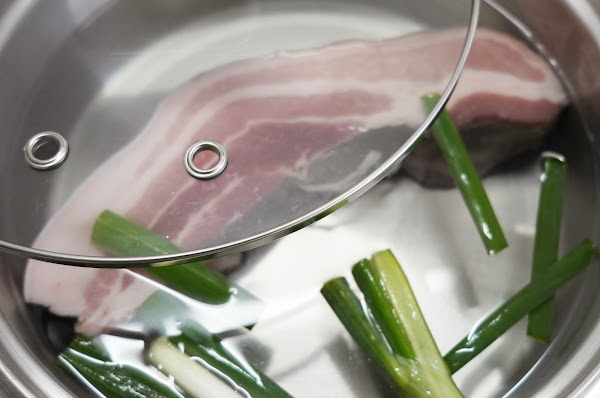 1.帶皮五花肉使用蔥薑水汆燙後,使用刀背刮除豬皮表面的髒污