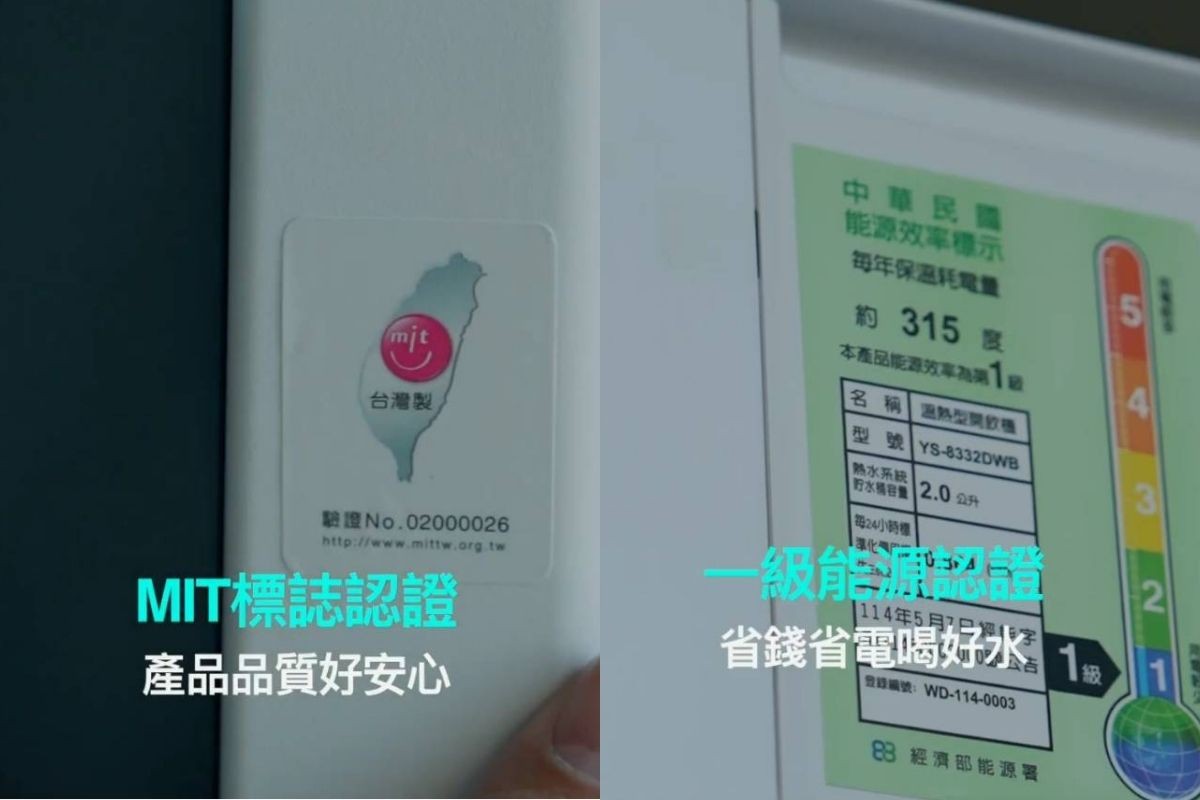 MIT的認證標章,是優質產品的證明,灰常熱還有國家一級能源效率認證,不僅享用好水還可以省荷包,完全不需要擔心使用飲水機會有耗電的問題。另外產品本身也有節能模式,在低電耗的情況下保溫。