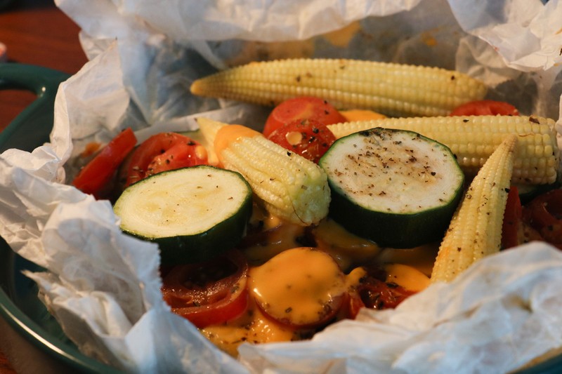 先將烤紙泡水後擠乾,鋪在烤盤上,放入喜歡的蔬菜(可自由變化),灑上義式香料、黑胡椒與少許鹽,再淋上一點橄欖油,最後把起司撕成小塊鋪在上面。