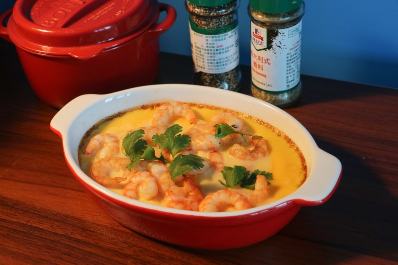 現在要補食材時特別有感,直接在蒸蛋上鋪滿蝦仁後再送回烤箱,調整旋鈕為上大火模式再烤約 8 分鐘,蝦仁蒸蛋就完美上桌了
