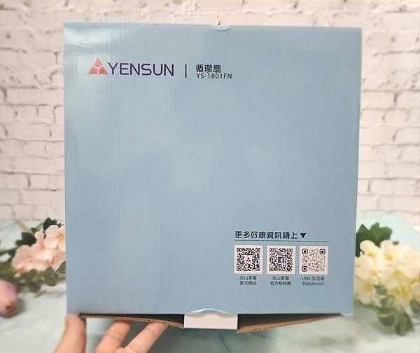 輕巧的外箱只以簡單的藍白色為主色交疊,箱子最上方則有QR CODE,可供掃描至元山家電官網、臉書、Line等處,無論是產品保固服務、資訊家電好康活動、優惠訊息都不怕會漏接。