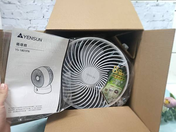 將外箱打開後,一台純白乾淨的【循環扇YS-1801FN】主機映入眼簾,裡頭還有一本產品說明書可以參考。