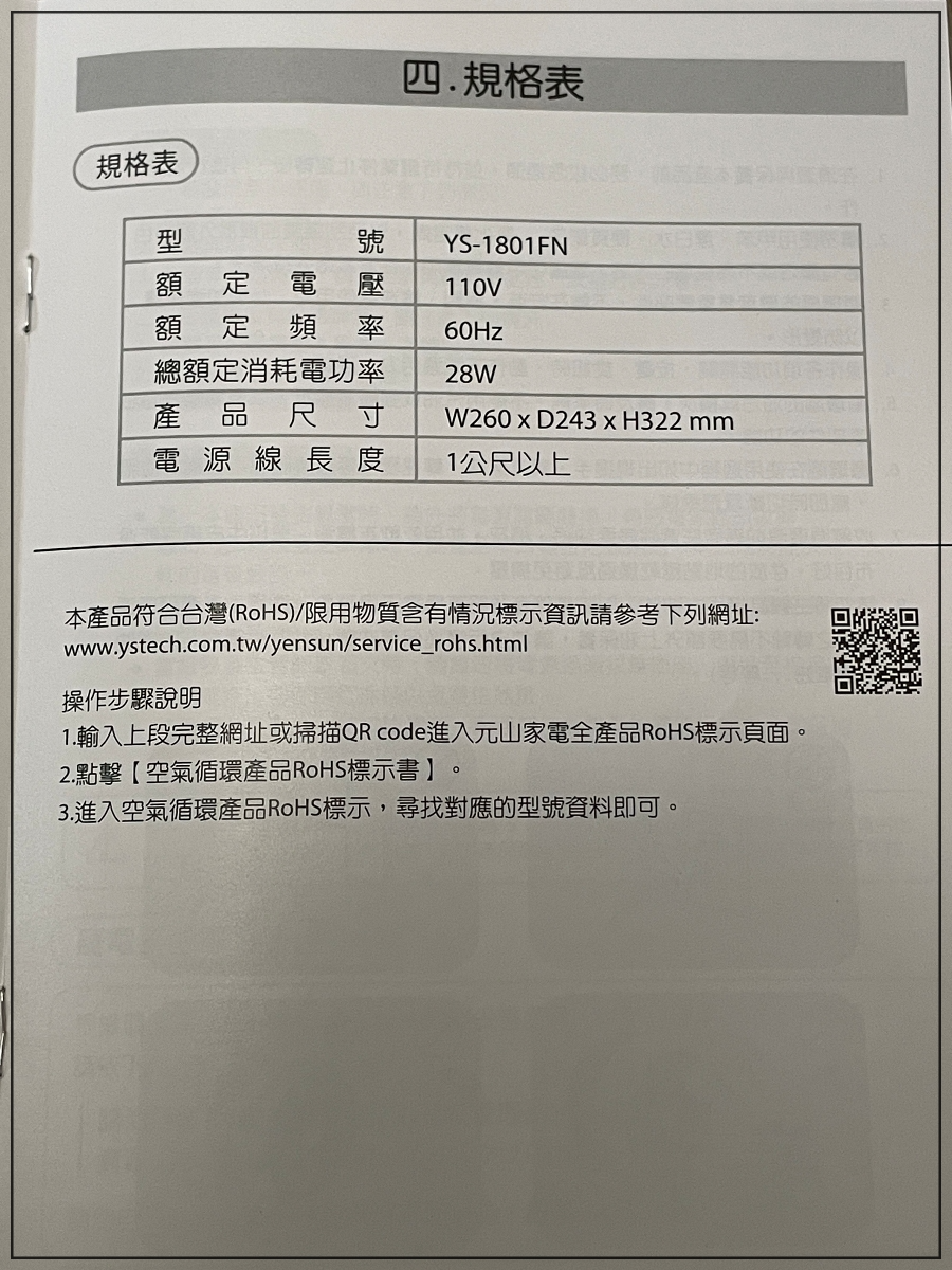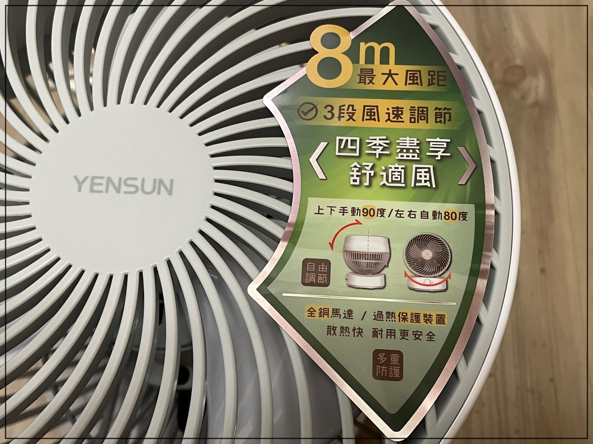 元山家電循環扇YS-1801FN在產品細節部分一點都不馬虎,且跟外商品牌相比價格還更具有競爭力。另外就是它重量僅2.3kg,在市面上眾多循環扇中算是比較輕的,如果需要帶著移動比較方便。還有市面上似乎不是所有的循環扇都會擺頭,因為循環扇本來的作用就跟電風扇不太一樣,循環扇的作用是增加空氣循環,不是拿來吹人的,所以擺頭與否似乎不是很必要。但在一些家電評比文章裡面都表示,有擺頭功能的循環扇,其循環面積及循環效果會比不擺頭的機型更好,所以最後我還是選了有擺頭功能的機型。最後的考量點就是價格了,著名的VORNADO以風力強、循環遠著稱,不過大部分家庭不是什麼大坪數住宅,似乎也不需要這麼強力的循環扇,而且以物理特性而言,大風力相對也會比較吵,最後在價格考量下還是選擇了差不多一張小朋友左右的元山家電循環扇YS-1801FN。
