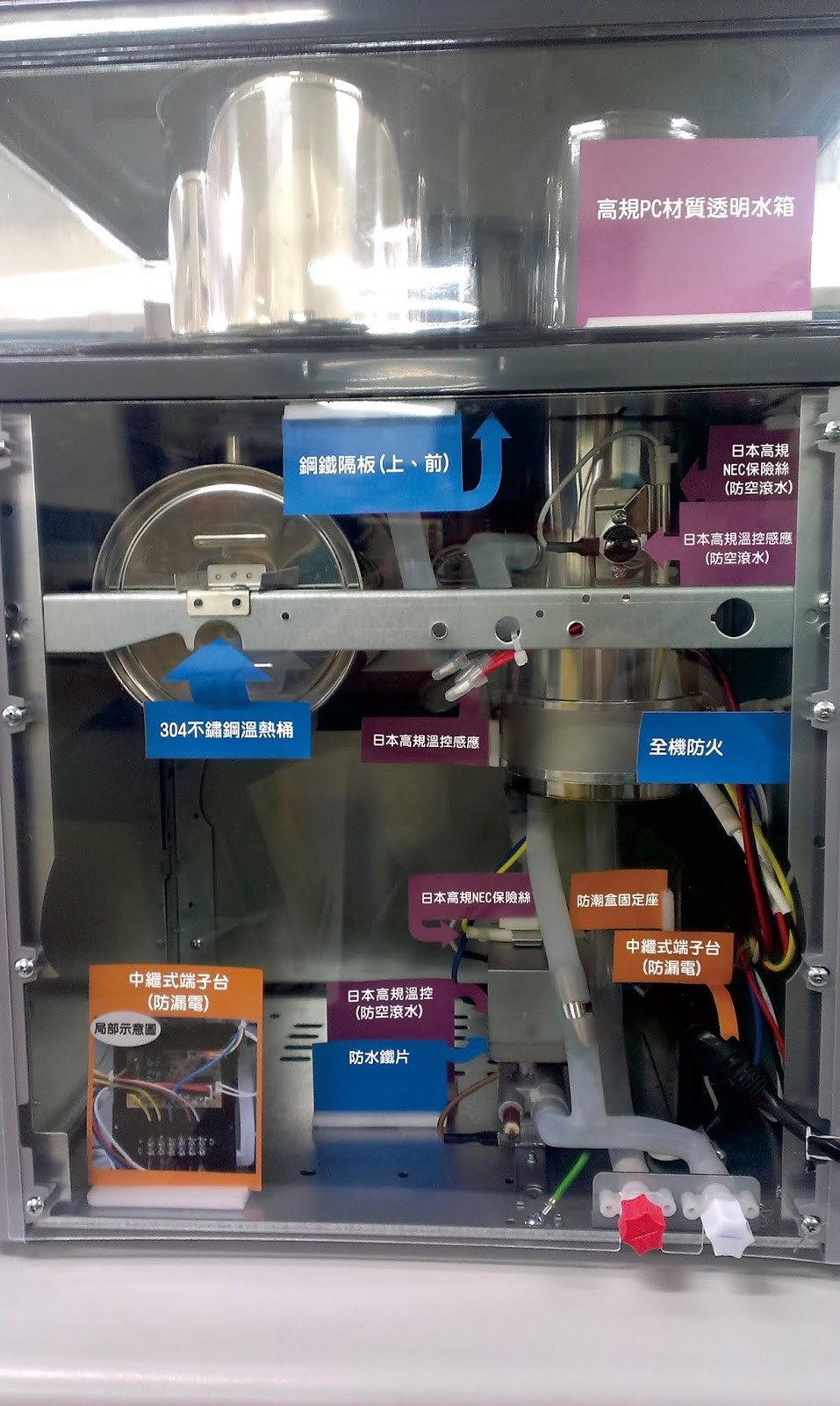 ① 溫度保險絲: 是保護零件過熱時的安全裝置。採用日本NEC零件,當溫度超過標準時,加熱超時保護機制啟動,避免熱水乾燒。
