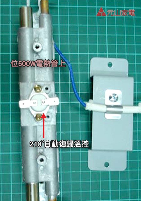 - 手動復歸210 ℃溫控:防止500W電熱管內因堵塞無水經過時,電熱管過熱燒毀或起火之危險。
