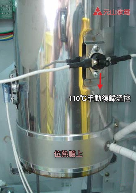 - 手動復歸110 ℃溫控:防止熱水桶內之無水乾燒,也防止電熱器燒毀之虞。