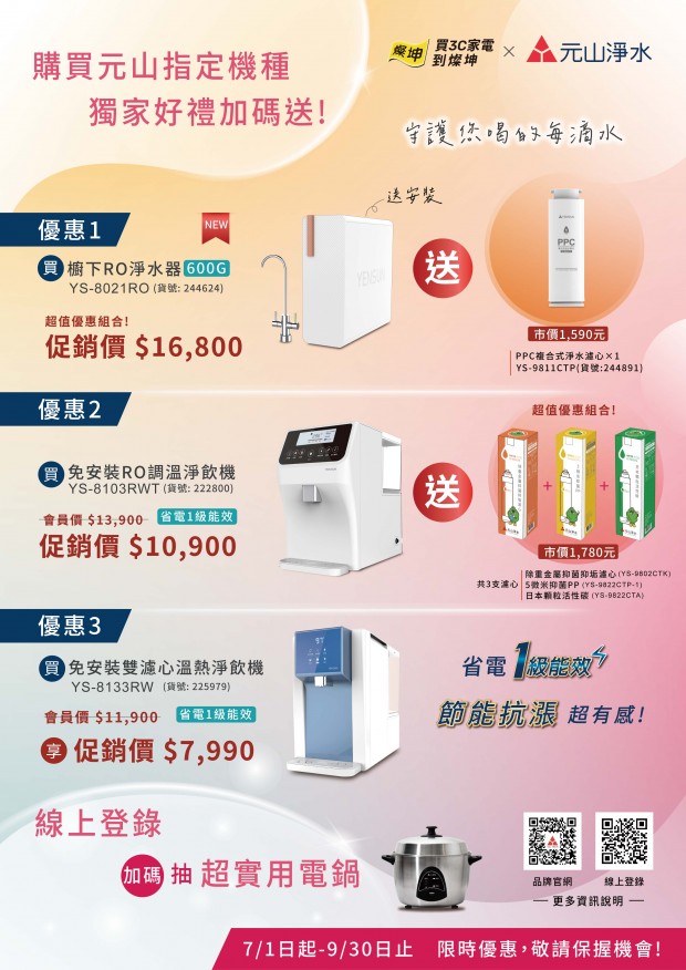 元山淨水X燦坤_購買指定機種,獨家好禮加碼送活動開跑囉!