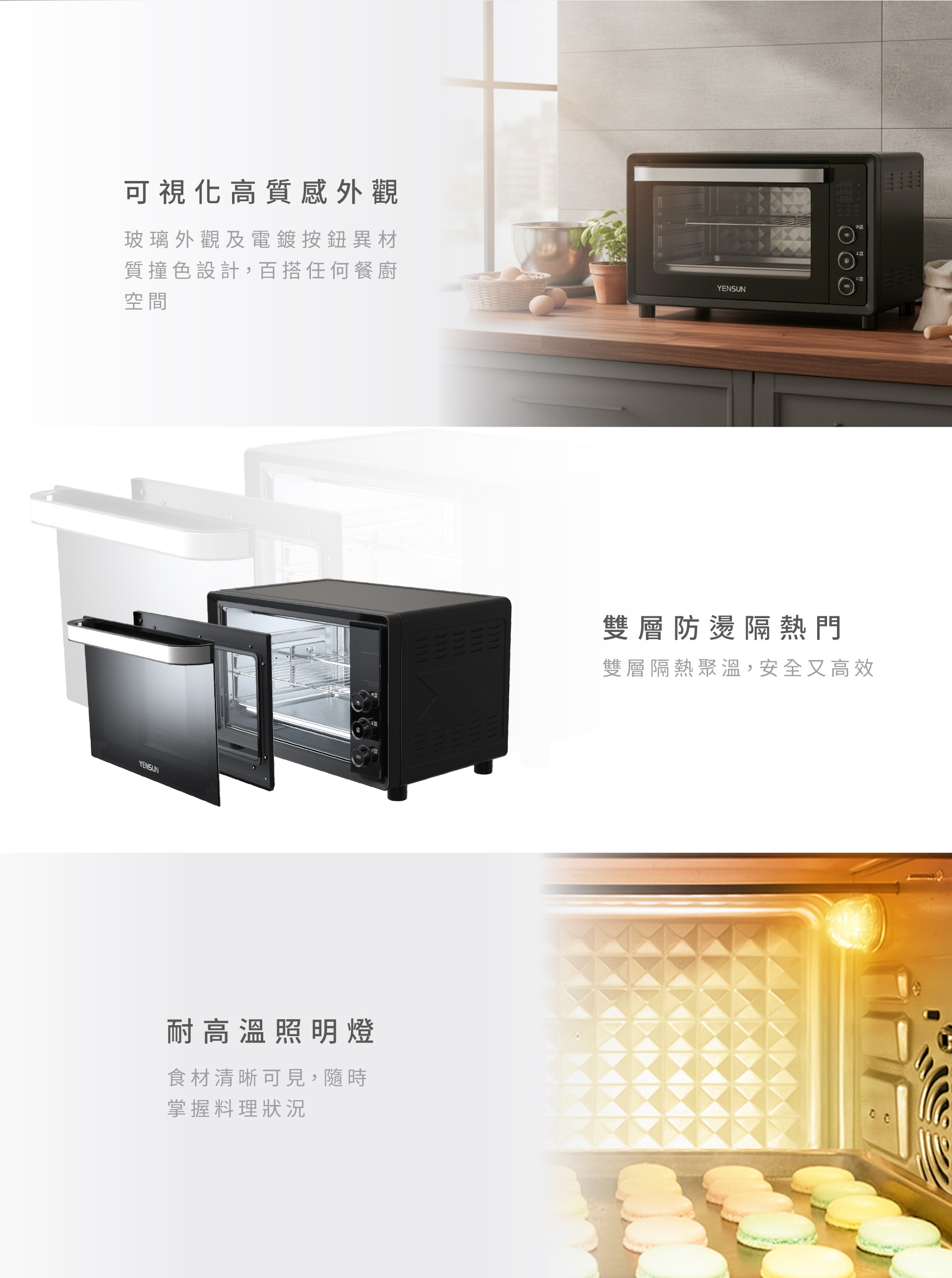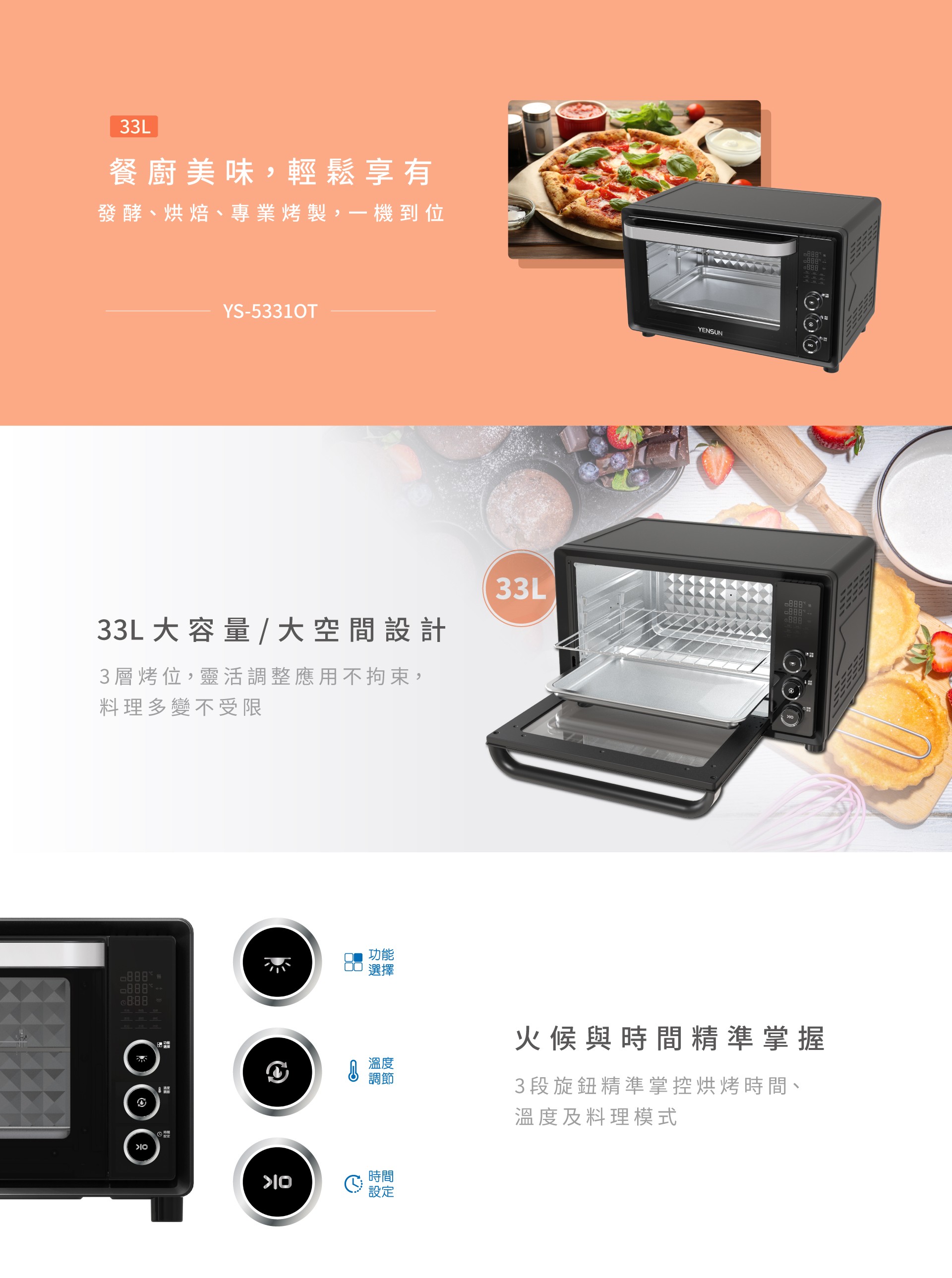 1.33L大容量/大空間設計,3層烤位,靈活調整應用不拘束