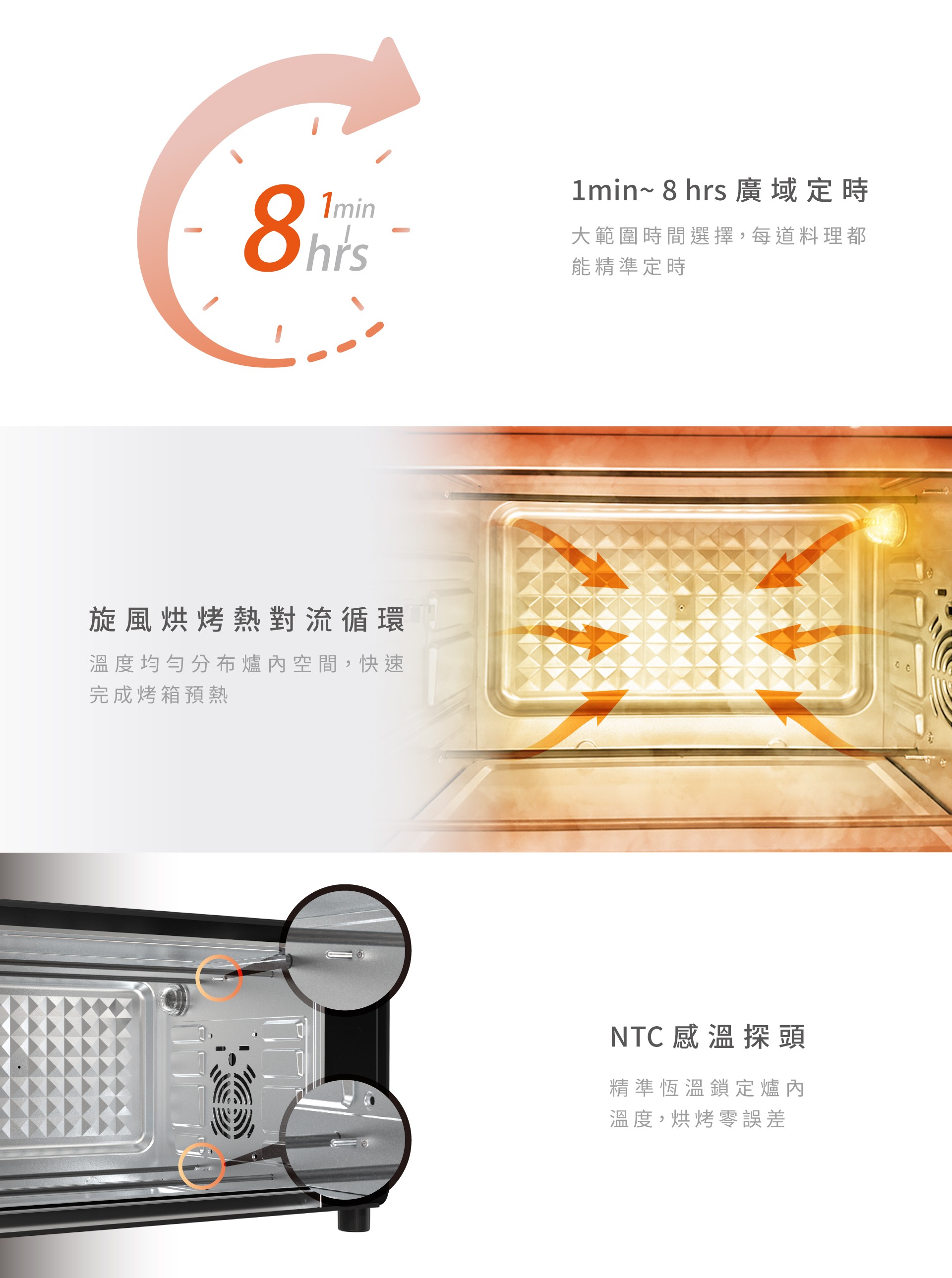2.3段旋鈕精準掌控烘烤時間、溫度及料理時間