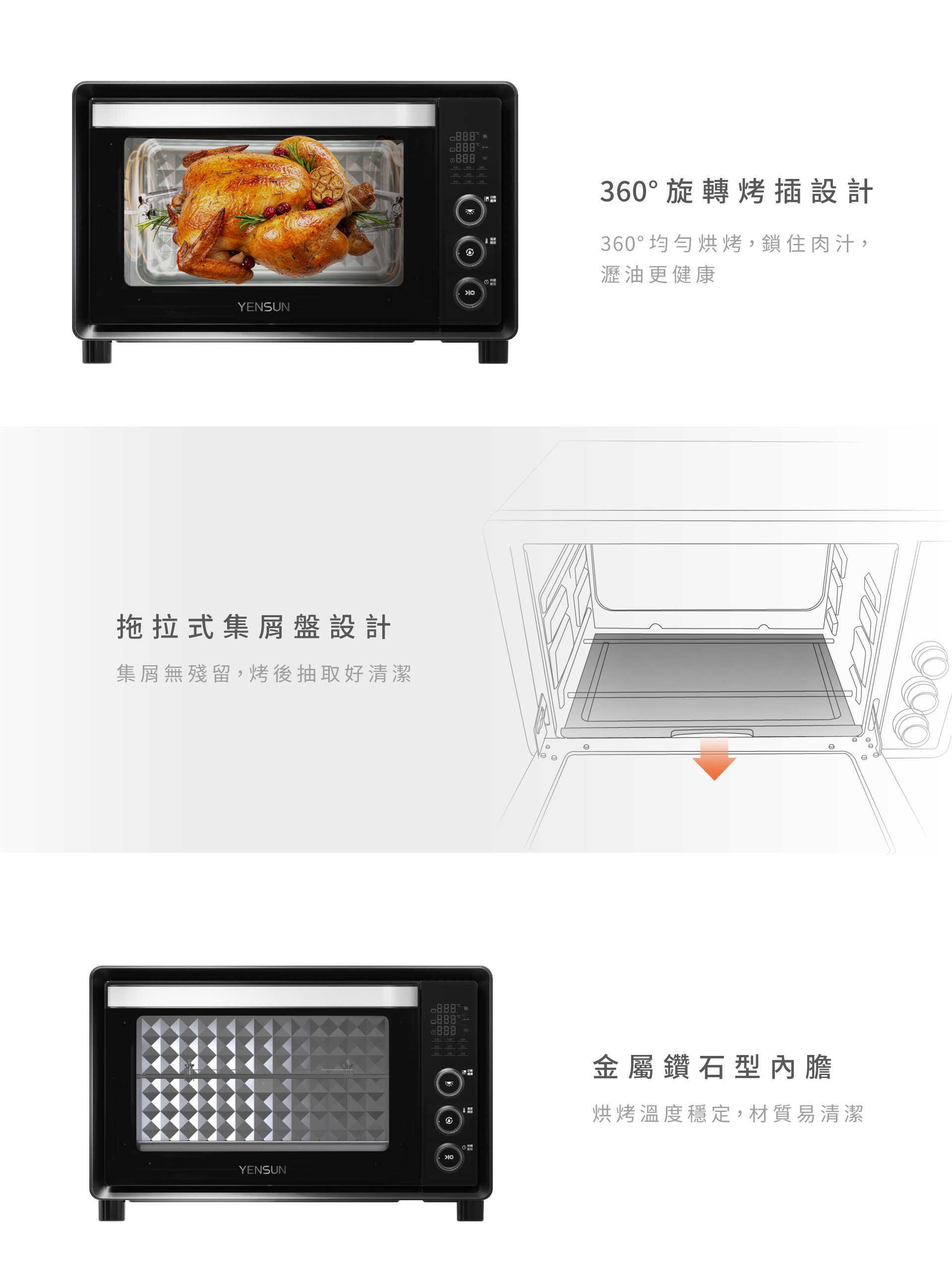12.360°旋轉烤插設計,360°均勻烘烤,鎖住肉汁,瀝油更美味