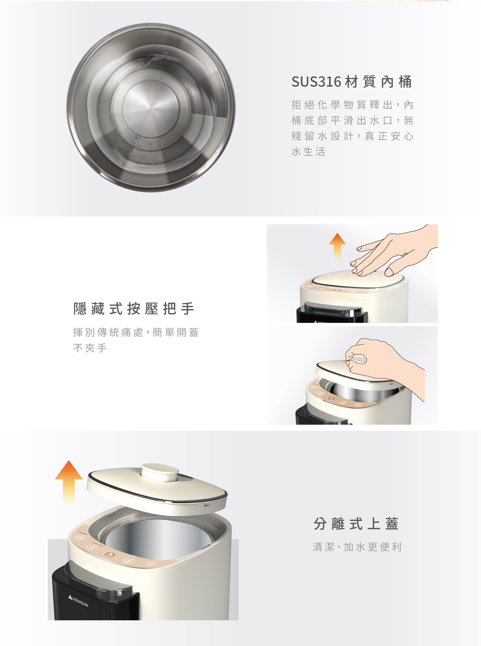 5.隱藏式按壓把手,簡單開蓋不夾手